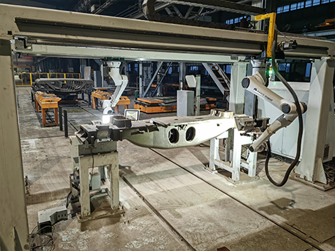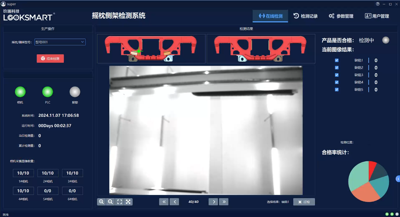 采用桁架搭载协作机器人,多相机多工位协作,快速完成摇枕侧架的表面图像采集,通过定制化算法,完成字符识别、尺寸检测和表面缺陷检测等功能,大幅提升检测效率和精度。